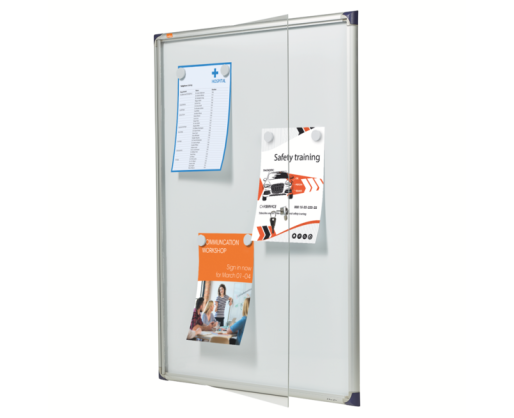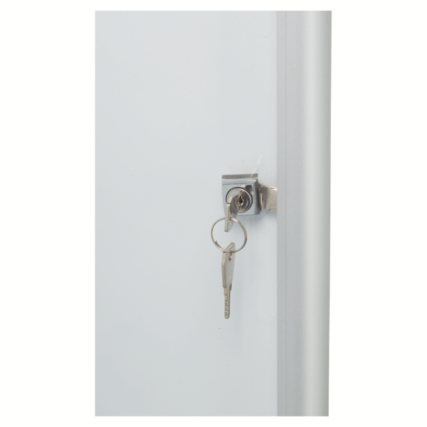 Itin plona, ypač kompaktiška magnetinė informacinė lenta su rakinamomis skaidraus akrilo durimis ir saugiu užraktu su 2 rakteliais, skirta naudoti patalpose.