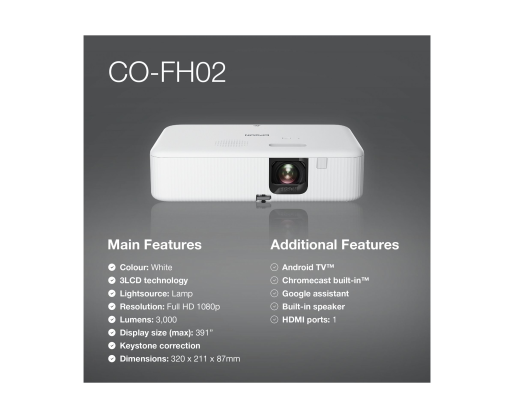 - Epson 3LCD projector CO-FH02 Full HD (1920x1080), 3000 ANSI lumens, White, Lamp warrant...
