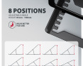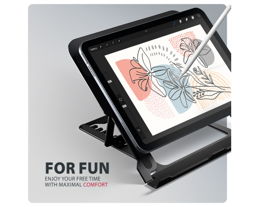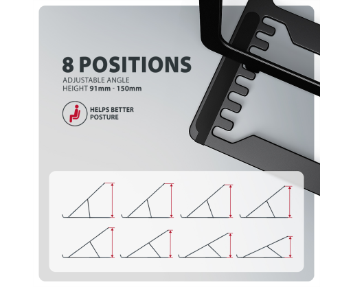 | Kitos savybės | Lightweight and strong metal construction; Anti-slip finish, which also protects the device from scratches; Eight adjustable positions |