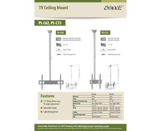 - Sunne | Ceiling mount | PL-C62 | Tilt | 37-70 " | Maximum weight (capacity) 50 kg | Sil...