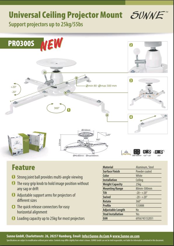 Sunne | Projector Ceiling mount | Turn, Tilt | White 160602