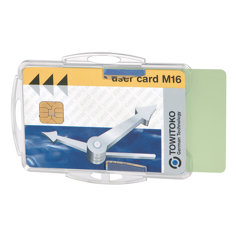 Matmenys: 54 x 85 mm. Galima naudoti vertikaliai arba horizontaliai. Galima įdėti 2 korteles. Pagamintas iš aukštos kokybės polistireno. Be laikiklio. Galima naudoti su grandinėle, juostele ar specialiu laikikliu, kurio virvutė automatiškai susivynioja (150-00738, 150-00745). Skaidrus. Dėžutėje 10 vnt.Prekės parametrai