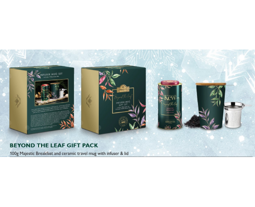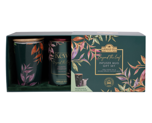 KJU DOVANŲ RINKINYS – bendradarbiaujant su Kju karališkuoju botanikos sodu sukurtas mūsų apdovanojimus pelnęs „Majestic Breakfast“ mišinys įdėtas į gražaus dizaino daugkartinio naudojimo metalinę dėžutę ir aukščiausios kokybės keraminį puodelį su birios arbatos infuzoriumi ir dangteliu. Puiki dovana tikram arbatos mėgėjui šį atostogų sezoną.