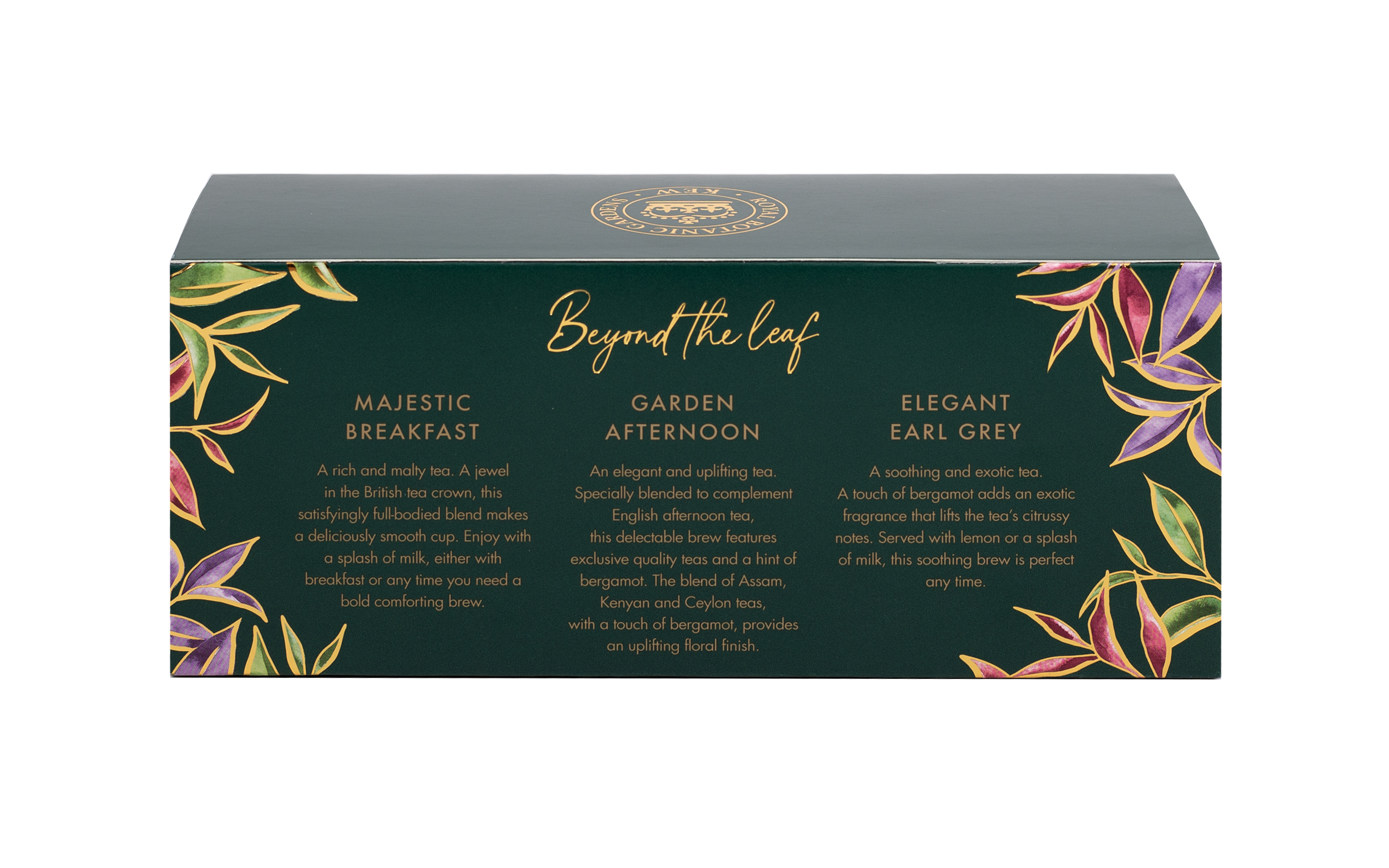 ARBATOS RINKINYS – tai elegantiškas 3 firminių juodosios arbatos mišinių pasirinkimas, sudėtas į 30 arbatos maišelių (po 10 kiekvienam mišiniui), kurį sudaro „Majestic Breakfast“, „Elegant Earl Grey“ ir „Garden Afternoon“ arbatos.
