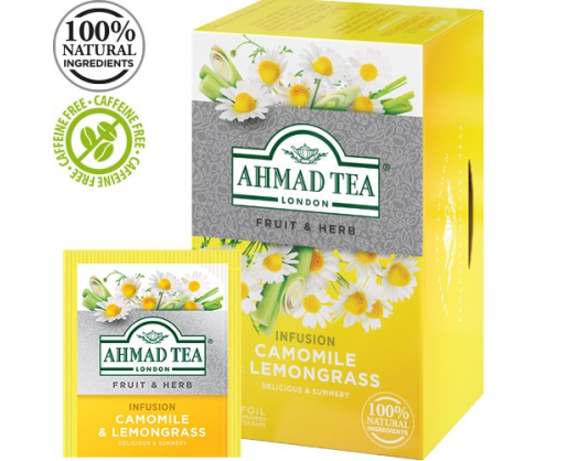 AHMAD TEA Camomile & Lemongrass natūrali arbata. Ramunėlių ir citrinžoles skonio. Kiekvienas arbatos pakelis supakuotas folija dengtame vokelyje. Po 1,5 g. Dėžuitėje 20 arbatos pakelių.Prekės parametrai