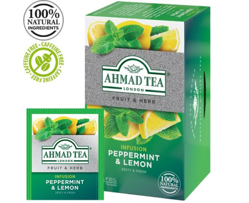 AHMAD TEA Peppermint & Lemon Natūrali arbata. Pipirmėčių ir citrinos skonio. Kiekvienas arbatos pakelis supakuotas folija dengtame vokelyje. Po 1,5 g. Dėžutėje 20 arbatos pakelių.Prekės parametrai