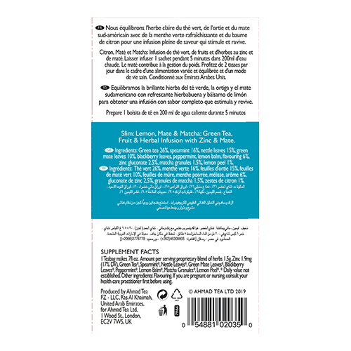 Laikytis sveikos mitybos gali būti sudėtinga, tačiau mūsų „Slim Infusion“ užpilas padės pasisemti jėgų iš motinos gamtos. Medžiagų apytaką skatinantis mačios ir cinko mišinys su valomuoju mėtų, citrinų balzamo ir kofeinu papildytu matės deriniu sukuria natūraliai stimuliuojantį ir stiprinantį gėrimą. Pajuskite energijos antplūdį (ir paskatinkite medžiagų apykaitą), vartodami šį puikaus skonio, jėgas atkuriantį arbatos užpilą.