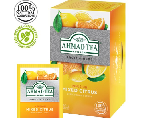 AHMAD TEA MIXED CITRUS. Natūrali arbata. Įvairių citrusinių vaisių skonio. Kiekvienas arbatos pakelis supakuotas folija dengtame vokelyje. Po 2 g. Dėžutėje 20 arbatos pakelių.Prekės parametrai
