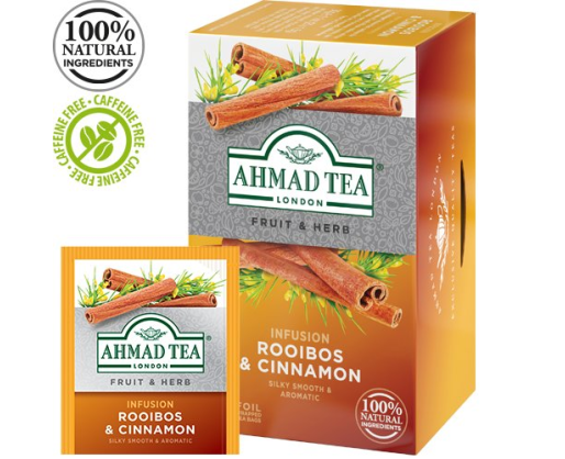 AHMAD TEA ROOIBOS & CINNAMON. Natūrali arbata. Raudonoji ir cinamono skonio. Kiekvienas arbatos pakelis supakuotas folija dengtame vokelyje. Po 1,5 g. Dėžutėje 20 arbatos pakelių.Prekės parametrai