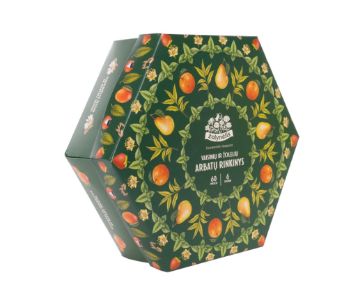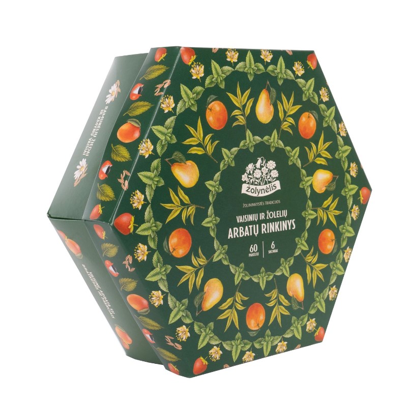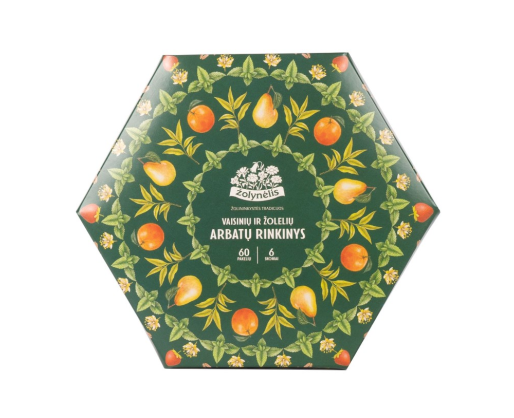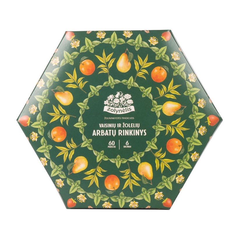- Žolelių ir vaisinių arbatų rinkinys, ŽOLYNĖLIS 60 vnt, 6 rūšys po 10 vnt, 91 gr.