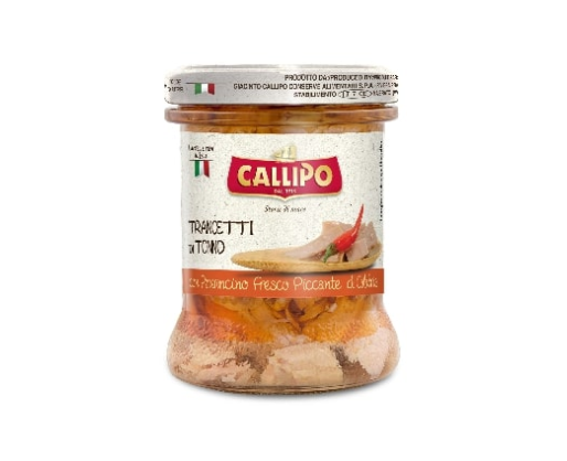 Gelsvauodegių tunų gabaliukai, CALLIPO, su aitriosiomis paprikomis, alyvuogių aliejuje 170g