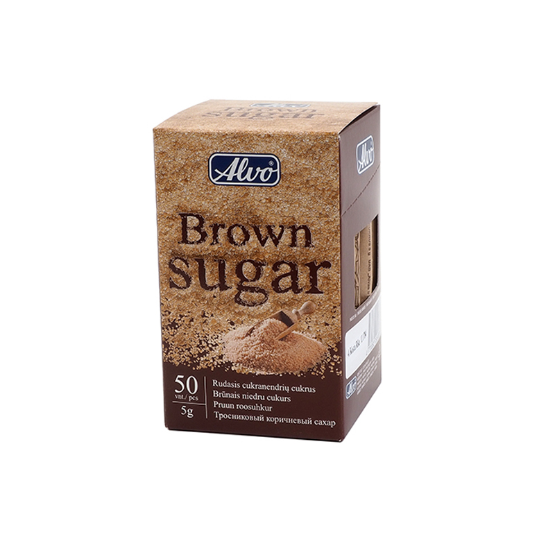 - Fasuotas cukrus ALVO, rudas, 50 vnt po 5 g