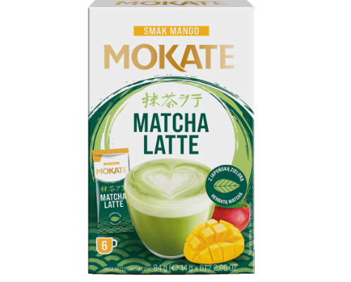 - Žaliosios arbatos gėrimas MOKATE latte matcha ir mango skonio, 6 x 14g