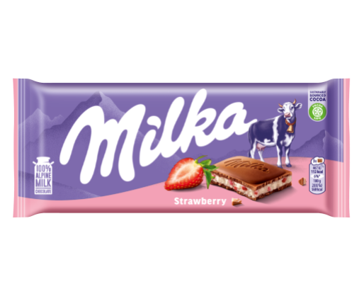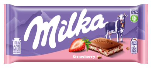 - Pieninis šokoladas MILKA, iš Alpių pieno, su braškių skonio įdaru, 100 g