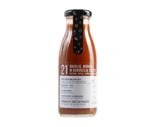 Sudėtis: obuolių sultys 70%, morkų tyrė 20%, burokėlių sultys 10%.