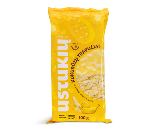 - Kukurūzų trapučiai USTUKIŲ MALŪNAS, su bananų skonio glaistu, 100 g