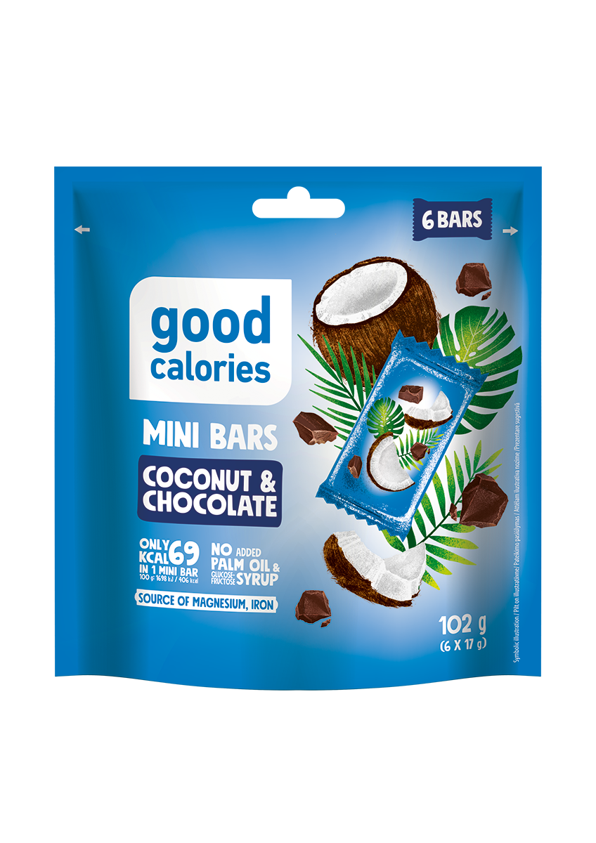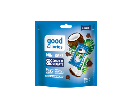 - Mini riešutų batonėliai GOOD CALORIES su kokosais ir šokoladu, 102 g