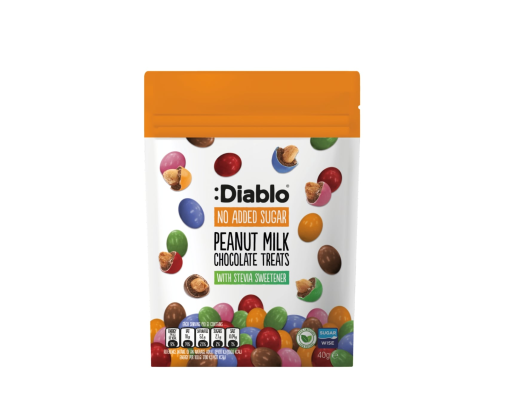 - Žemės riešutų skanėstai, padengti pieniniu šokoladu, DIABLO, be pridėtinio cukraus, 40g
