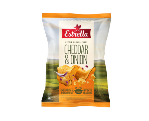 Bulvių traškučiai ESTRELLA KETTLE čederio ir raudonųjų svogūnų skonio, 120g