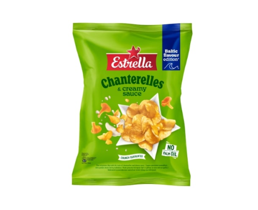 - Bulvių traškučiai ESTRELLA, lygaus pjaustymo voveraičių ir sūrio padažo skonio, 170 g