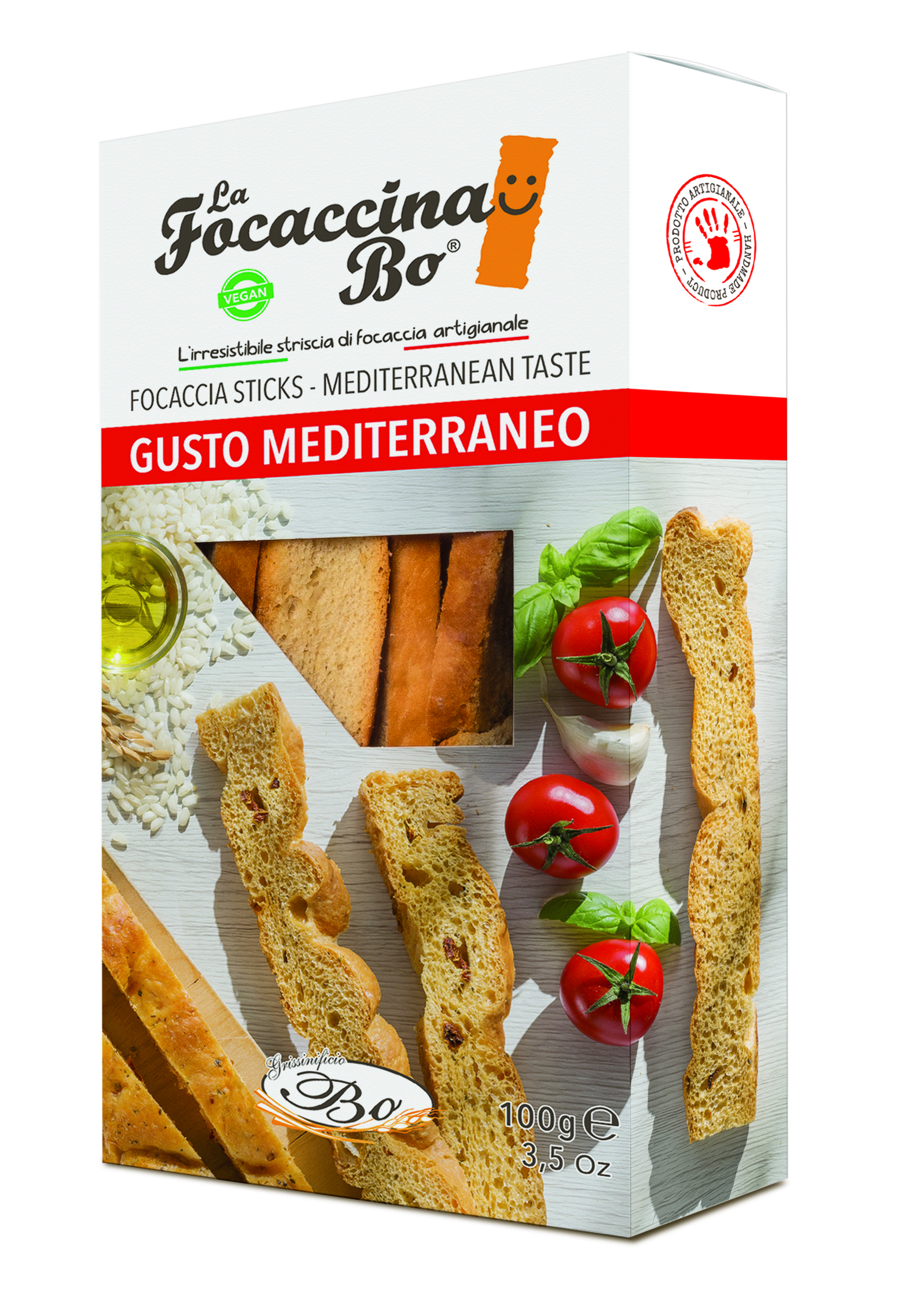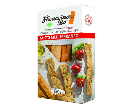 - Duonos lazdelės FOCACCINA, Gusto Mediterraneo, su pomidorais, žolelėmis, 100 g