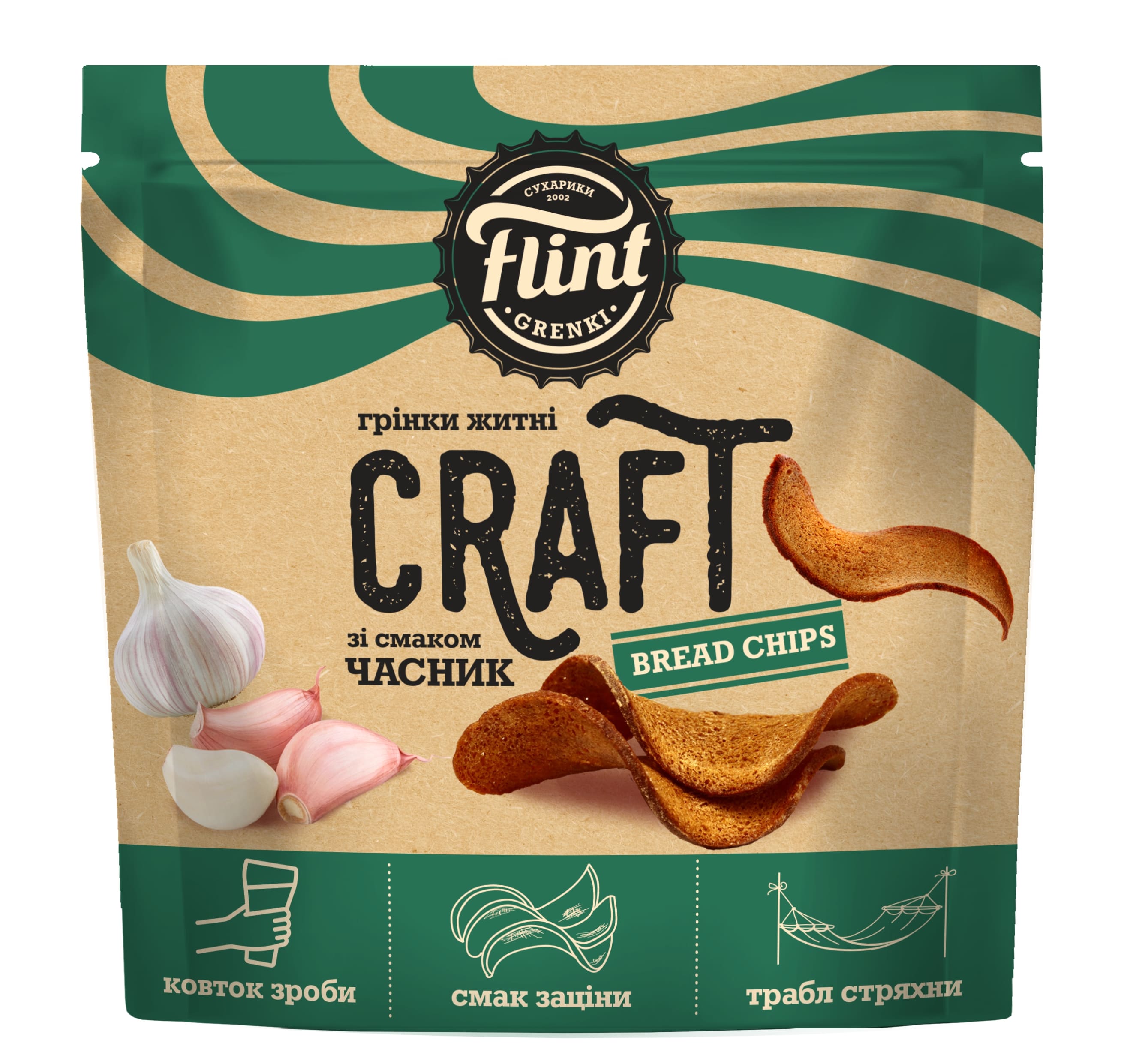Duonos traškučiai FLINT, Craft, vingiuoti, česnakų skonio, 80 g