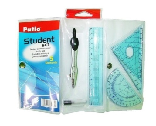 • Į komplektą įeina: liniuotė, 2 trikampiai, matlankis, skriestuvas, grafitai skriestuvui