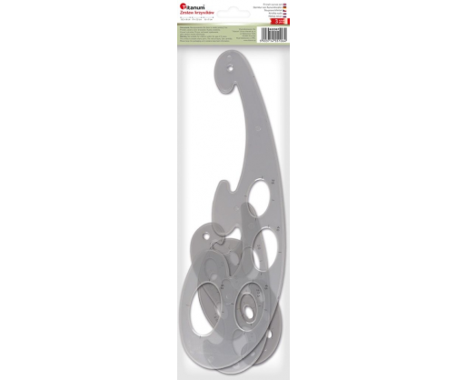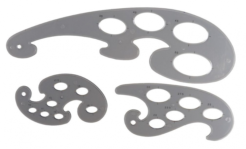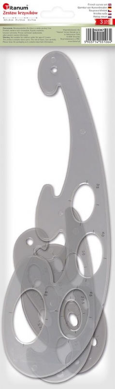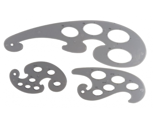 Tvirtų plastikinių lenktų lekalų rinkinys. Lekalai turi įpjovas piešimui rašalu ir apsaugas nuo išsitepimo. Rinkinį sudaro 3vnt., skirti parabolinėms, hiperbolinėms ir elipsinėms formoms. Matmenys: 31,5 x 9 cm, 17 x 7,5 cm ir 13 x 7 cm.
