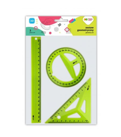 Geometrinis rinkinys susidedantis iš 4 elementų: liniuotė 15cm.du trikampiai ir matlankis. Linuot4spavarios, lanksčios ir puoštos puikiais piešiniais.