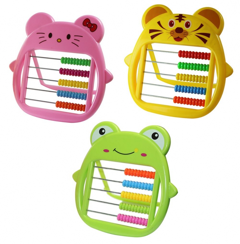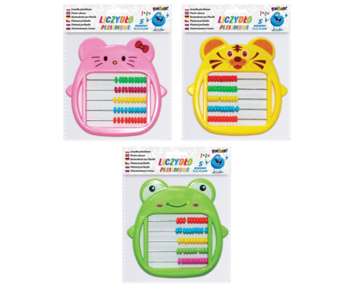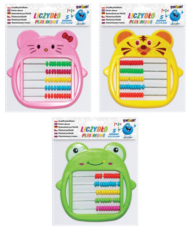 5 eilių plastikiniai skaitliukai su stabilia atrama. Matmenys: 15,5 x 15,2 cm. Galimos 4 spalvos, raštai: pelė, varlė, tigras. Supakuota maišelyje su kabykla.