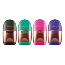 Trintukas su apsauginiu dėklu ir drožtuku MILAN CAPSULE COPPER. Minkštas, sintetinis, guminis, ovalus trintukas, su kuriuo galėsite trinti daugelio skirtingų grafito pieštukų žymes nuo bet kokio tipo popieriaus. Trintuko dėklo apačioje įtaisytas patogus drožtukas su aštria ir tvirta geležte, tinkama bet kokio tipo pieštukams. Apsauginė geležtės sistema apsaugo nuo geležtės atsiskyrimo nuo drožtuko. Dėklo dizainas ryškių spalvų ir auksinių detalių derinys.
