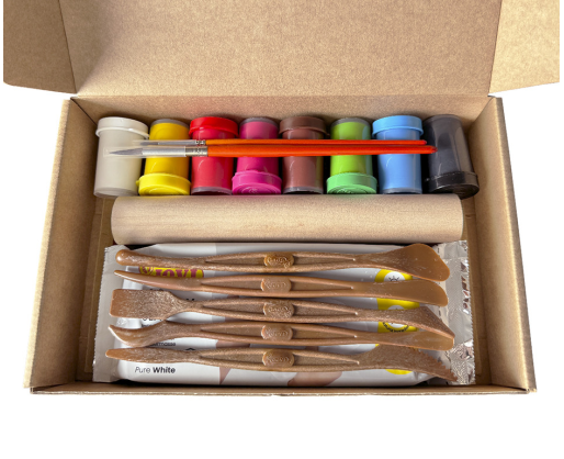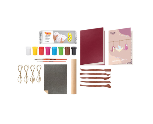 Rinkinį sudaro:500 g oro sauso molio, 1 smeigtukas, 5 modeliavimo reikmenys, 1 švitrinis popierius, 8 spalvų guašas 15 ml, 2 meniniai teptukai, 1 užrašų knygutė ir 4 lininės virvelės.