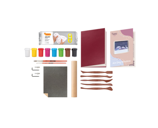 Rinkinį sudaro:Instrukcija, 500 g oro sauso molio, 1 smeigtukas, 5 modeliavimo reikmenys, 1 švitrinis popierius, 8 spalvų guašo tempera 15 ml, 2 meniniai teptukai, 1 užrašų knygutė, 2 kabliukai ir 2 smeigtukai.
