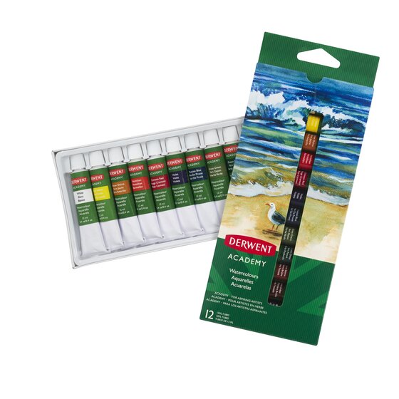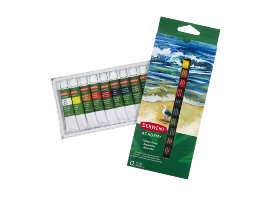 Derwent Academy akvareliniai dažai pagaminti iš ryškių pigmentų, puikiai tinka išgauti skaidrumo efektą, tinka naudoti vienus, ar sumaišytus su kitomis dažymo priemonėmis. 12 spalvų po 12 mililitrų tūbelėse. Naudokite tiesiai iš tūbelės arba praskieskite vandeniu ar dažymo priemone, kad spalvos efektas būtų lengvesnis.