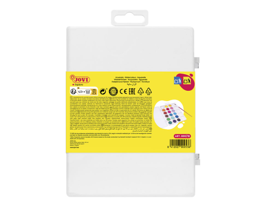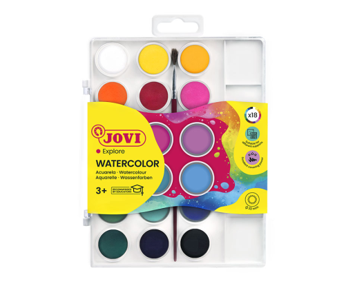 Akvareliniai dažai JOVI. Pagaminti vandens pagrindu. Tinka piešti teptuku. Spalvas galima lengvai maišyti. Ypatingai tinka vaikams, nes lengvai išsiplauna iš įvairių rūšių audinių. Skirti vaikams nuo 3 metų. 18 spalvų rinkinys. Spalvos neblunka saulėje.