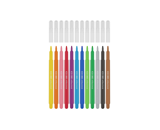 Antibakterinio pluošto flomasteriai ICO, 12 spalvų pakuotė. Flomasteriai užpildyti vandens pagrindo rašalu bei turi apsauginį ventiliacinį kamštelį. Skirti piešimui ir spalvinimui. Plastikinių dalių sudėtyje yra Biomaster sidabro jonų, kurie suteikia antibakterinę apsaugą (biocidinė veiklioji medžiaga: sidabro fosfato stiklas). ICO antibakteriniai produktai turi baktericidinių savybių, o mikrobai nužudomi per 24 valandas, 99,9% efektyvumu. Antibakterinį aktyvumą išbandė ir patvirtino Industrial Microbiological Services Ltd. Registracijos numeris: 3264423.Prekės parametrai