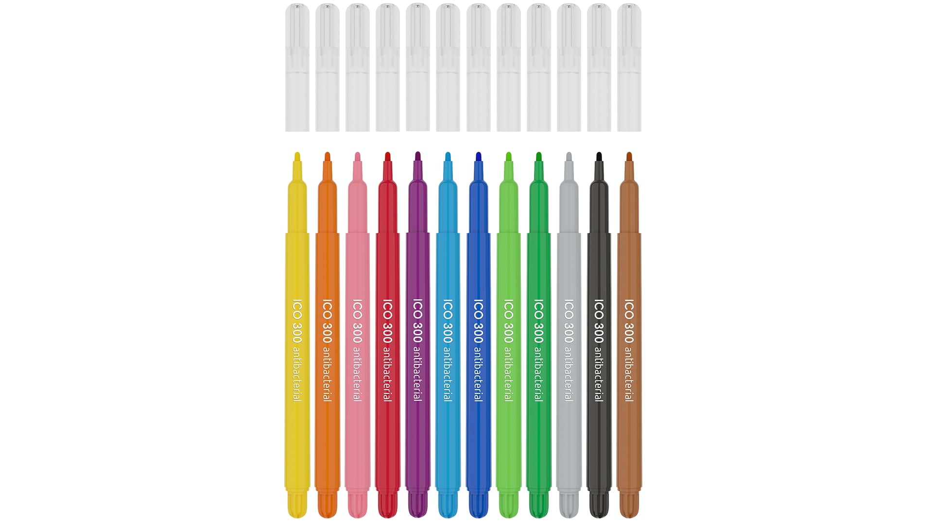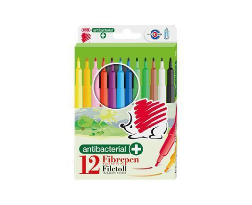 Antibakterinio pluošto flomasteriai ICO, 12 spalvų pakuotė. Flomasteriai užpildyti vandens pagrindo rašalu bei turi apsauginį ventiliacinį kamštelį. Skirti piešimui ir spalvinimui. Plastikinių dalių sudėtyje yra Biomaster sidabro jonų, kurie suteikia antibakterinę apsaugą (biocidinė veiklioji medžiaga: sidabro fosfato stiklas). ICO antibakteriniai produktai turi baktericidinių savybių, o mikrobai nužudomi per 24 valandas, 99,9% efektyvumu. Antibakterinį aktyvumą išbandė ir patvirtino Industrial Microbiological Services Ltd. Registracijos numeris: 3264423.Prekės parametrai