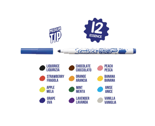 • Kiekvienas flomasteris turi skirtingą kvapą suderintą su jo spalva.