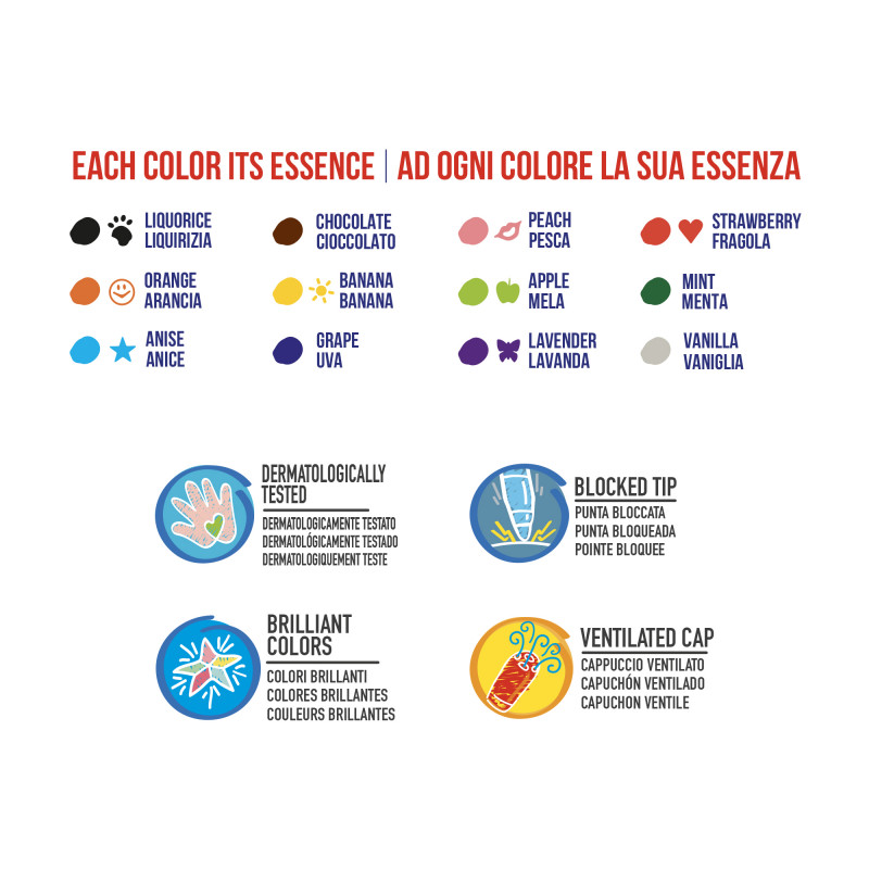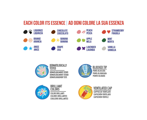 • Pakuotėje 30 kvepiančių įvairių spalvų flomasterių su spalvotais antspaudais;