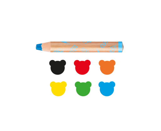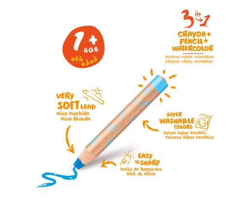 • Dėžutėje yra 6 BABY 1+ trys-viename kreidelės: Pieštukinė, Vaškinė and Akvarelinė vienoje kreidelėje
