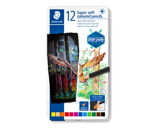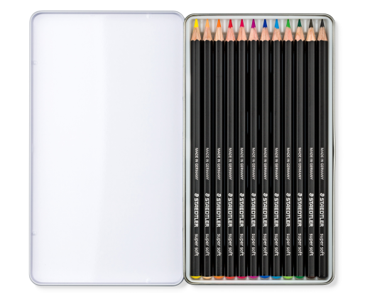 STAEDTLER® 149C Itin švelnūs spalvoti pieštukai. Aukštos kokybės spalvoti klasikinės šešiakampės formos pieštukai. Itin minkštas švinas, užtikrinantis ypač didelį padengimą. Nuostabioms ryškioms spalvoms ant balto ir juodo popieriaus. Mediena iš PEFC sertifikuotų, tvariai tvarkomų miškų. Metalinis dėklas, kuriame yra 12 įvairių spalvų spalvotų pieštukų.