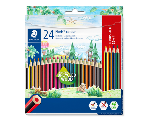 Noris® color 185 spalvoti pieštukai. Tobula šešiakampio formam pieštukas – pagamintas iš perdirbtos medienos. Minkštas neslidus paviršius ir didelis atsparumas lūžimui, kad būtų smagu piešti be rūpesčių. Mediena iš sertifikuotų, tvariai tvarkomų miškų. Kartoninės pakuotės yra pagamintos iš 80% perdirbtų medžiagų, kurias galima perdirbti dar kartą. Pakuotėje yra 20+4 įvairių spalvų spalvoti pieštukai.
