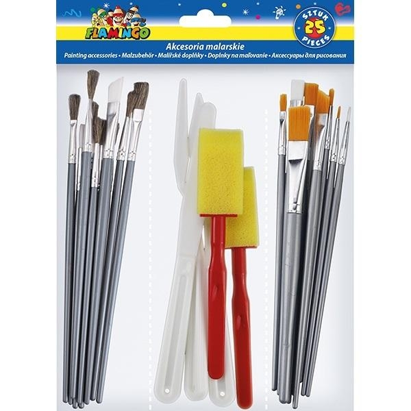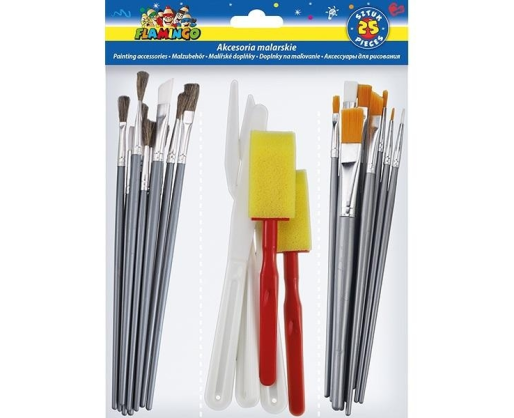 Rinkinys iš 25 tapybos priedų, kuriame yra įvairių dydžių teptukai ir mentelės. Rankenos pagamintos iš plastiko.