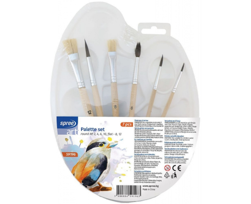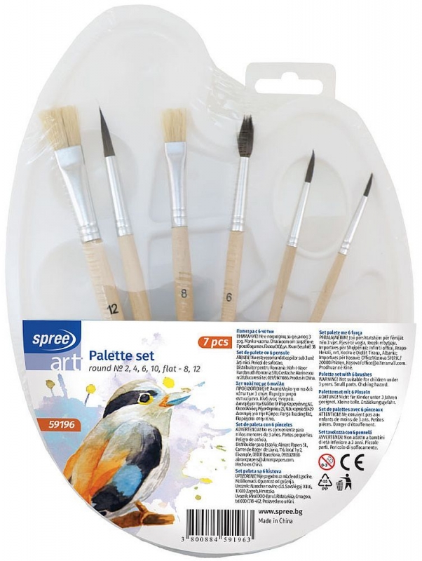 Rinkinį sudaro plastikinė paletė, 4 skirtingų storių teptukai akvarelei ir 2 teptukai guašui.