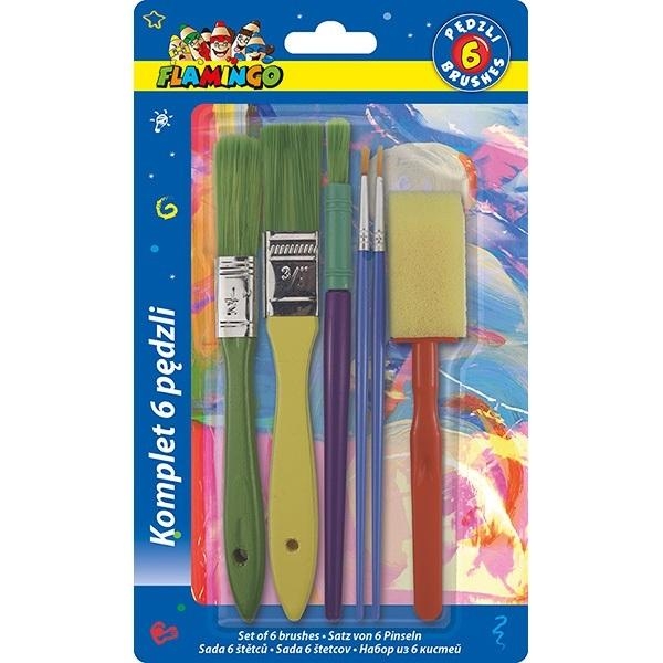 Rinkinys iš 6 teptukų, sudarytas iš 5 sintetinio plauko teptukų ir 1 kempininio teptuko. Spalvotos rankenos pagamintos iš medžio ir plastiko.