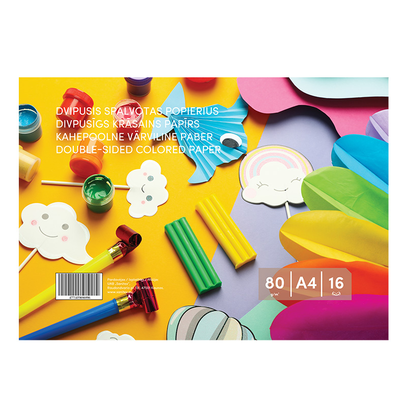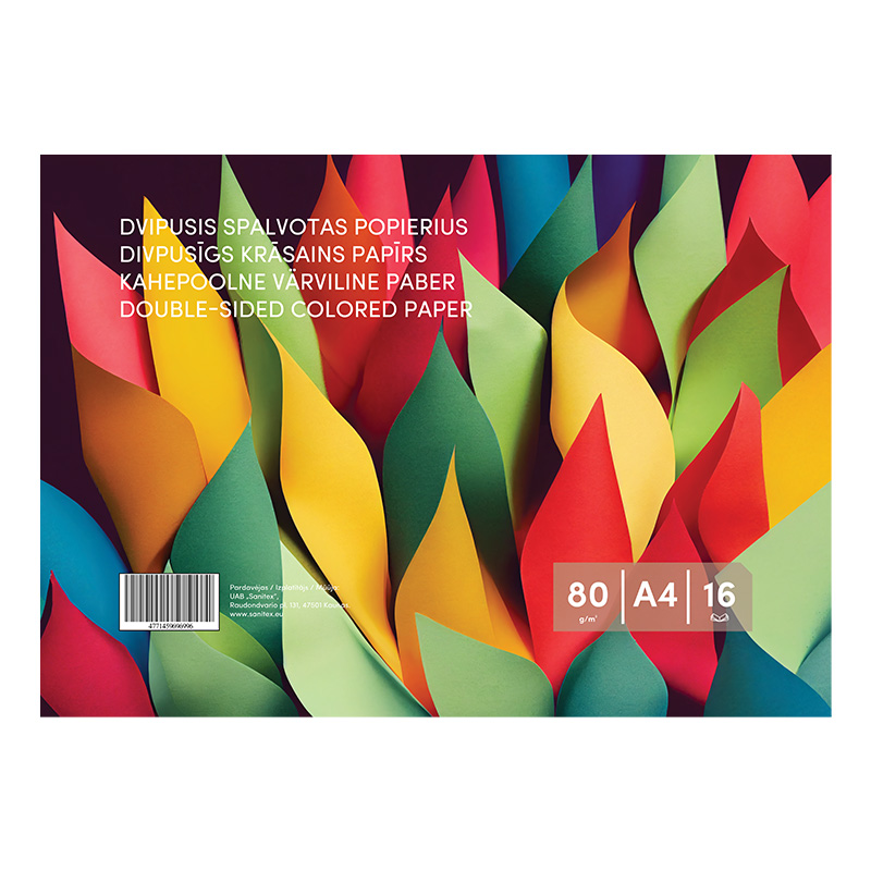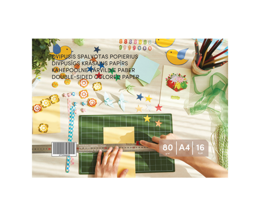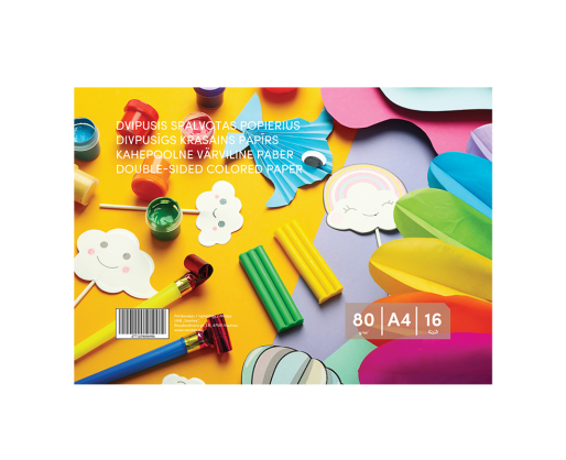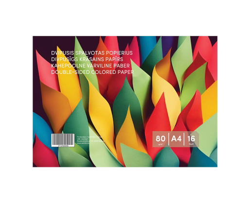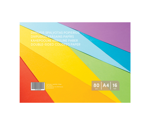 - Dvipusis spalvotas popierius, A4, 80 g/m², 16 lapų (8 spalvos x 2).