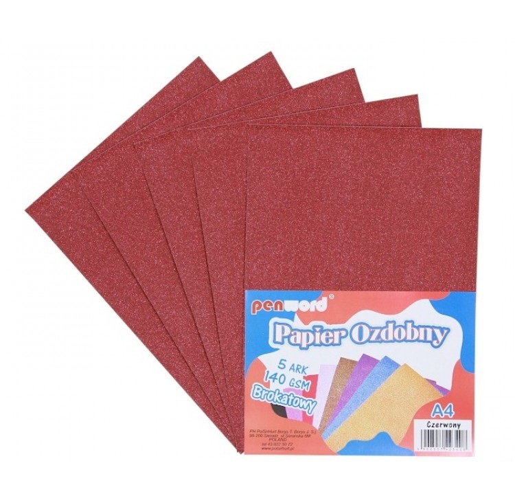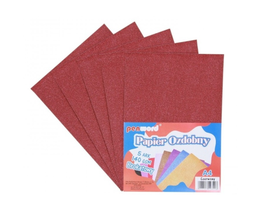- Blizgus kartonas PENWORD 140g, A4/5vnt. rinkinys, raudonas