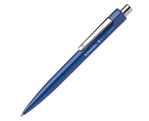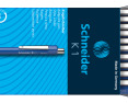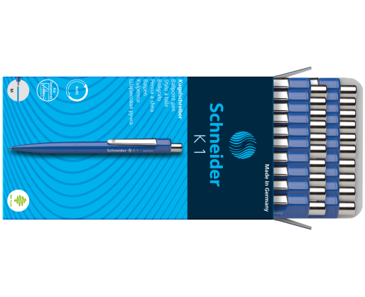Tušinukas Schneider K1. Mėlynos spalvos korpusas. Korpuso spalva atitinka rašalo spalvą. Su metalinė įsegėle. Vandeniui atsparus, mėlynos spalvos tušas. Atitinka ISO 12757-2 G1 standartą. Keičiama šerdelė EXPRESS 225 ar 75 serijos. Brėžio storis 1.0 mm.