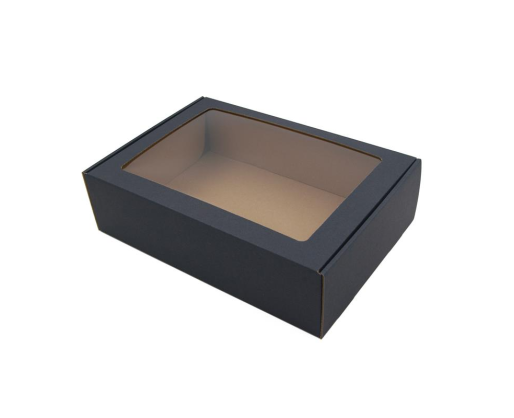 Juoda dovanų dėžutė su skaidriu langeliu. Standi, išlaiko formą, galima dėti sunkesnius daiktus. Tinka reprezentacijai, verslo dovanoms pakuoti.Matmenys: 305 x 215 x 85 mm.