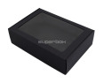 Juoda dovanų dėžutė su skaidriu langeliu. Standi, išlaiko formą, galima dėti sunkesnius daiktus. Tinka reprezentacijai, verslo dovanoms pakuoti.Matmenys: 305 x 215 x 85 mm.